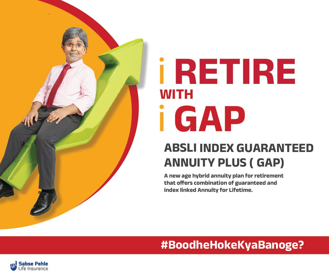 ¹ Annuitant Healthy Male: Age 55 years invests in ABSLI Index Guaranteed Annuity Plus| Annuity Option: Deferred Life Annuity with Return of Premium| Premium payment term: 10 years| Deferment period: 10 years| Annualized premium: Rs. 5,00,000| Annuity Pay-out Frequency: Annual | Premium payment frequency: Annual| Guaranteed component: 60%| Variable component: 40%. The Annuity amount of Rs. 5,87,188 (Guaranteed Annuity Rs. 2,70,900 + Variable Annuity Rs. 3,16,288) is shown for Age 65th year of the Annuitant basis historical growth rate. Guaranteed Annuity will remain same throughout the Life of the Annuitant, but the Variable Annuity varies every year.