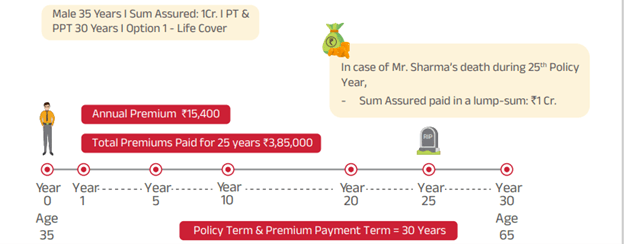 In this scenario, his Nominee is paid a lump-sum equal to Rs. 1 crore and the Policy terminates.